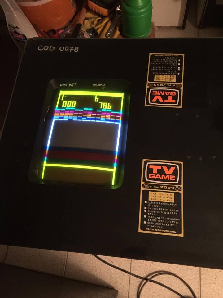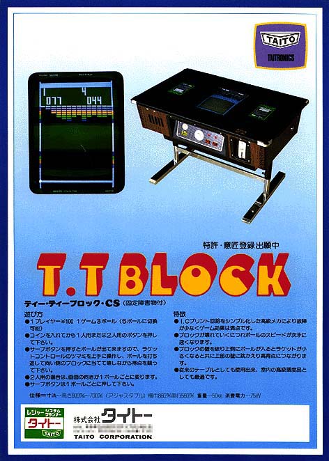 Presso il nostro stabilimento in provincia di Verona conserviamo due rari esemplari di T.T.Block, ambedue realizzati dalla Model Racing di Montemarciano sotto concessione della Taito. Si tratta di un titolo del 1977 a sua volta clone del più vecchio Breakout della Atari (1976) . Le iniziali T.T. stanno per Table Type, definizione della casa produttrice per indicare che si tratta di un cabinato di tipo Cocktail, ossia a forma di tavolino.